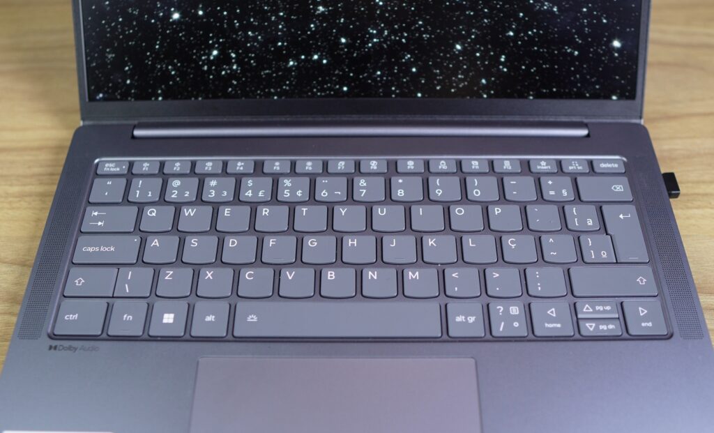 O teclado é um dos pontos que mais me agradaram. Ele oferece sensação de clique equilibrada, resistência no ponto certo e teclas espaçosas — algo que remete à experiência da linha ThinkPad. É retroiluminado em branco, outro diferencial em relação aos Slim 3 vendidos no Brasil.